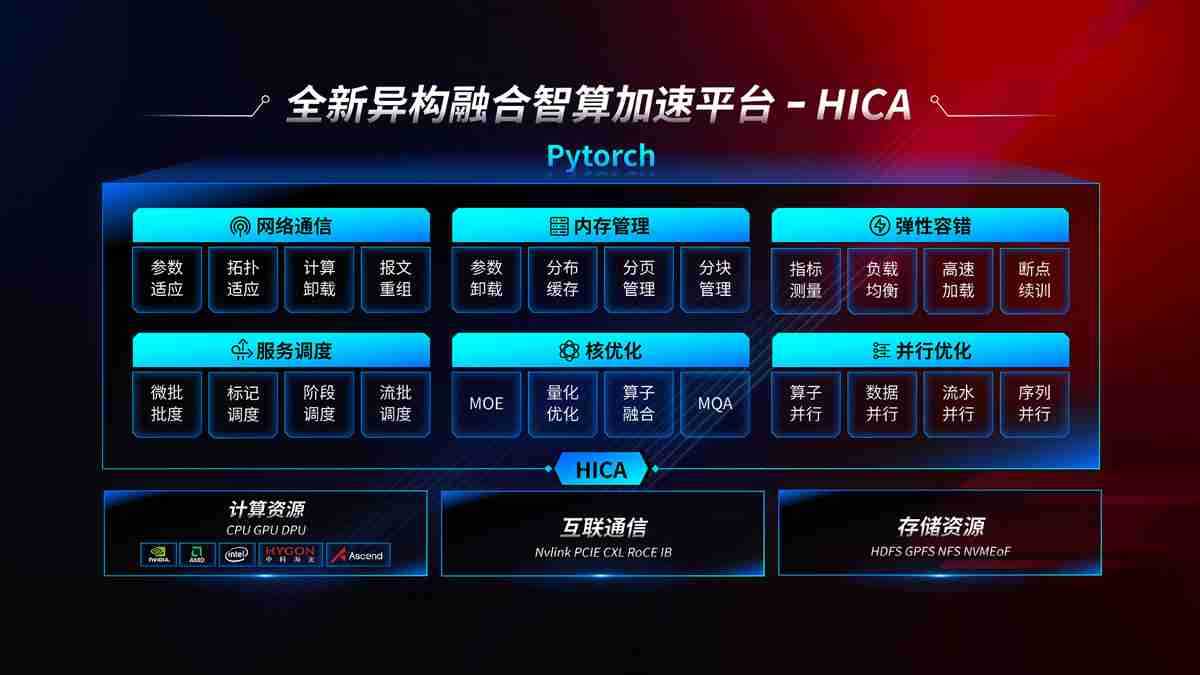通过自研的服务层、、、、中间适配层、、、以及调度编排算法,,采用数据并行、、、、模型并行等多种并行方式,,,,把并行计算任务进行有效的分解,,使其分别由相应的软件栈和算力资源来承接。。。当GPU资源变化,,HICA可以实时动态调度计算子任务并调整模型拓扑和架构,,,以充分聚合各种算力资源。。