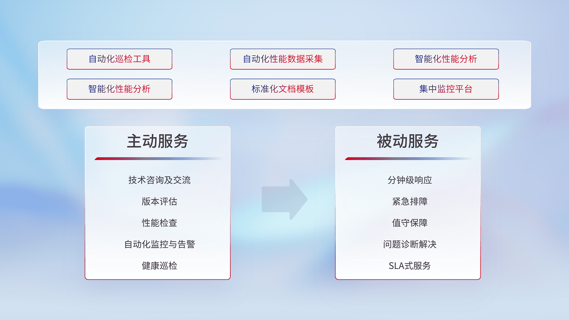 智能化工具和标准化文档,,保障服务质量,,,,提供主动服务(包含技术咨询、、、、版本评估、、、性能检查、、、、自动化监控与告警、、、、健康巡检)和被动服务包含(分钟级响应、、、、紧急排障、、值守保障、、、、问题诊断解决、、、SLA服务)。。